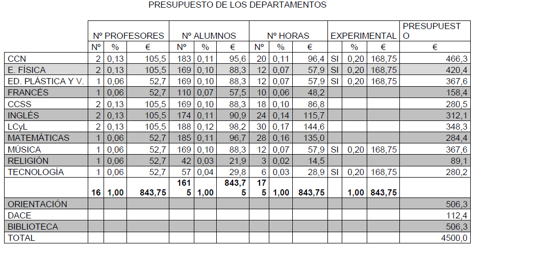 En la experimentación nosotros consideramos que un reparto equitativo de dinero en el presupuesto dependiendo de si un departamento realiza o no un proyecto de experimentación no es el más eficaz, ya que por ejemplo se requiere mucho más dinero para la adquisición del material que requiere un laboratorio de CCN que el que requiere el departamento de música donde los niños pueden comprar su propio material y llevarlo a clase.